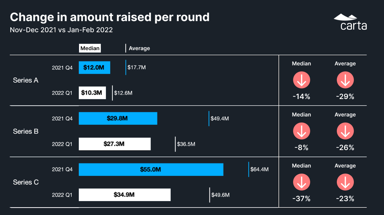 Series C rounds are the most extreme, seeing the largest median and average declines in amount raised
